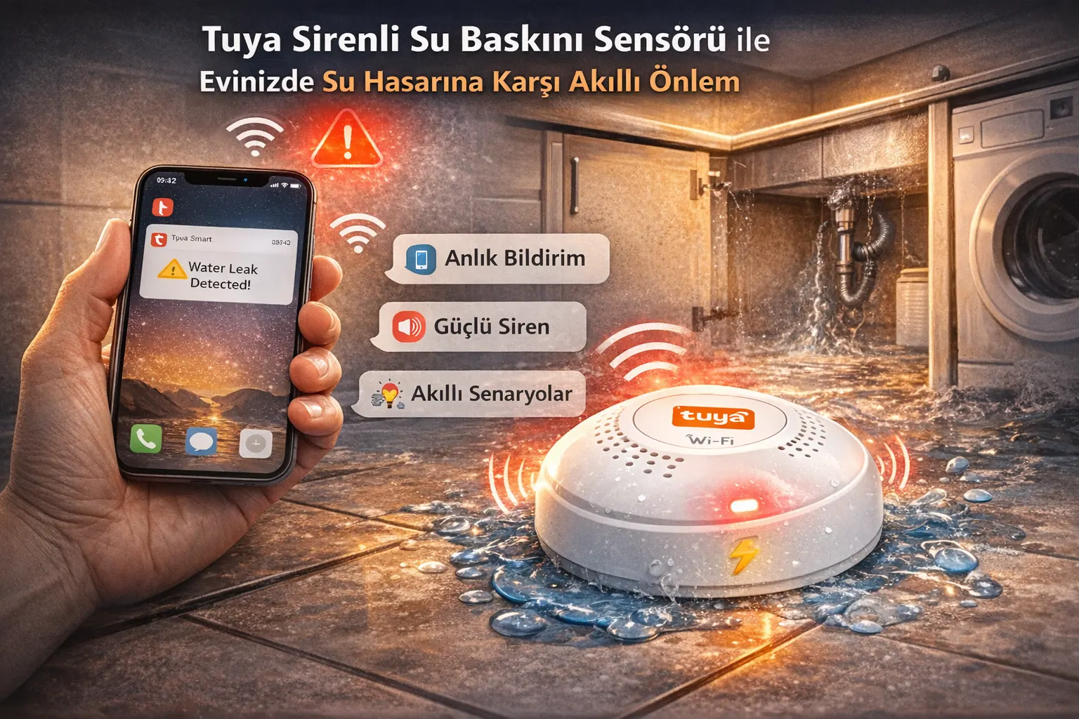Tuya Sirenli Su Baskını Sensörü, su sızıntısı veya su birikimi durumlarını anında algılayarak şu faydaları sağlar: