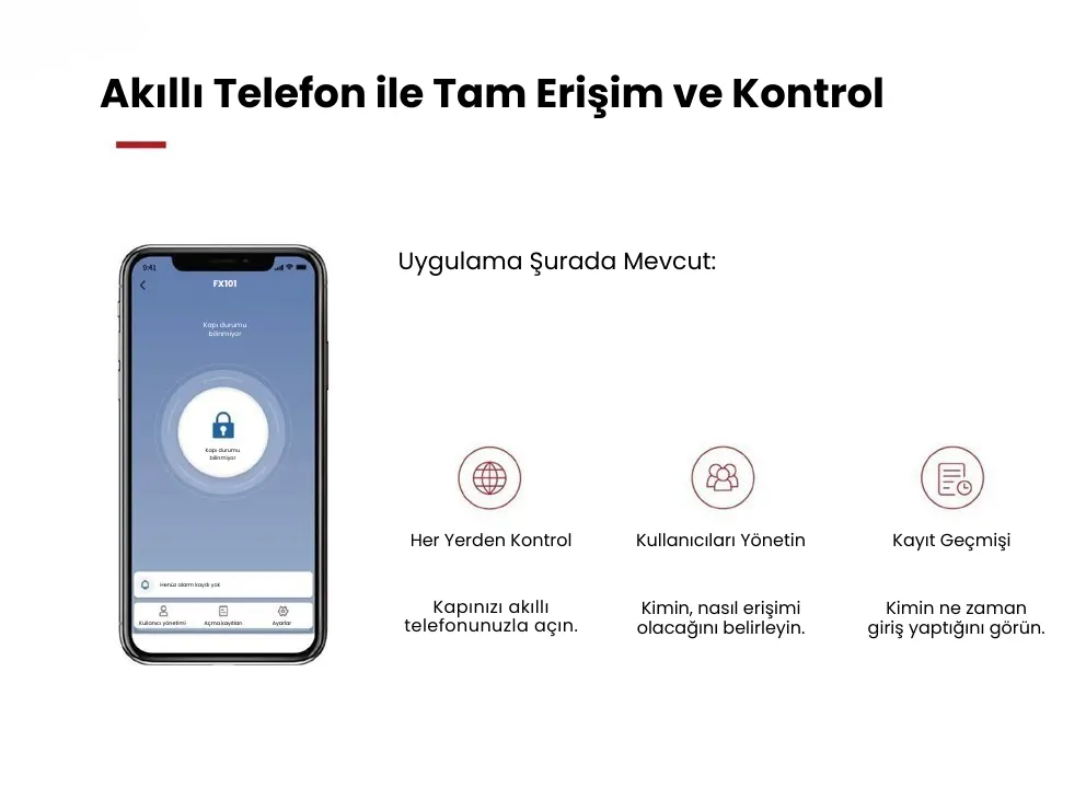 Parmak izi, şifre ve uzaktan kumanda desteği sayesinde FX101, farklı kullanıcı ihtiyaçlarına uyum sağlar. Parmak izi tanıma özelliği hızlı ve kişisel erişim sunarken, şifreli giriş seçeneği misafirler veya geçici kullanıcılar için ideal bir çözümdür. Kumanda desteği ise kapıya fiziksel temas olmadan pratik kontrol imkânı sağlar.