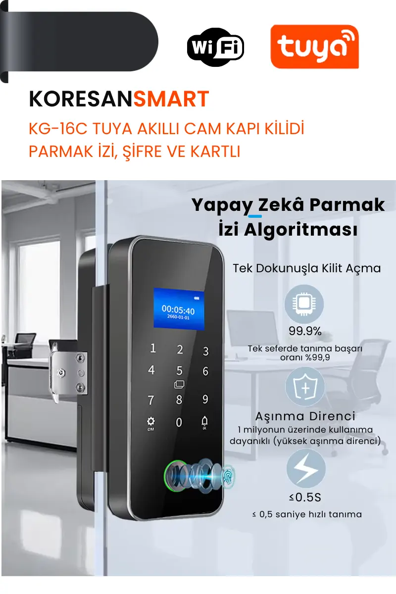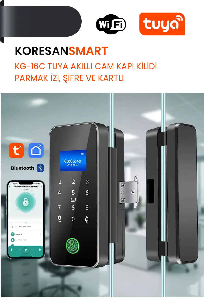 KG-16C Tuya Akıllı Cam Kapı Kilidi – Parmak İzi, Şifre ve Kartlı