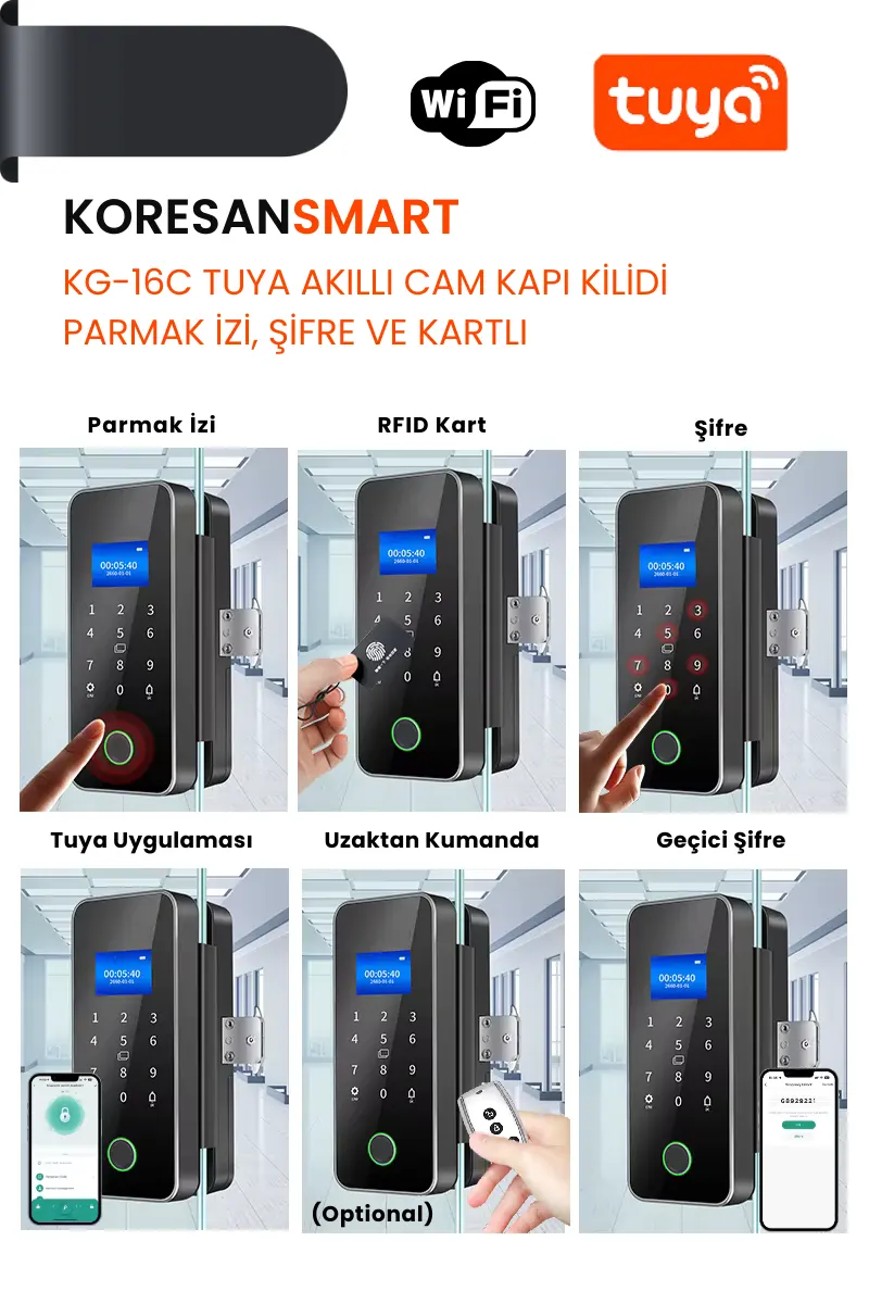 KG-16C Tuya Akıllı Cam Kapı Kilidi, parmak izi, RFID kart, şifre, Tuya uygulaması, uzaktan kumanda ve geçici şifre desteğiyle farklı kullanıcı ihtiyaçlarına uyum sağlayan gelişmiş bir akıllı kapı kilidi çözümü sunar.