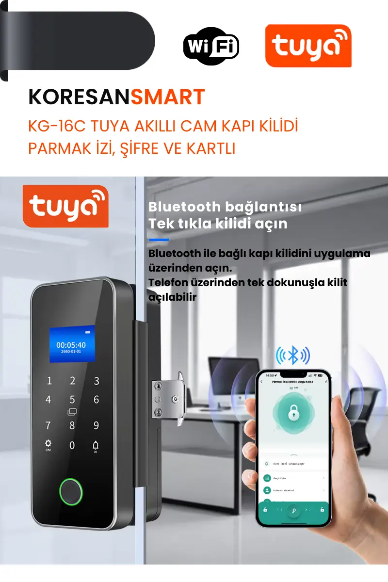 KG-16C Tuya Akıllı Cam Kapı Kilidi, Bluetooth bağlantısı ve Tuya uygulaması sayesinde kapınızı mobil cihaz üzerinden kontrol etmenizi sağlar; parmak izi, şifre ve kart ile modern cam kapılar için güvenli bir kullanım sunar.
