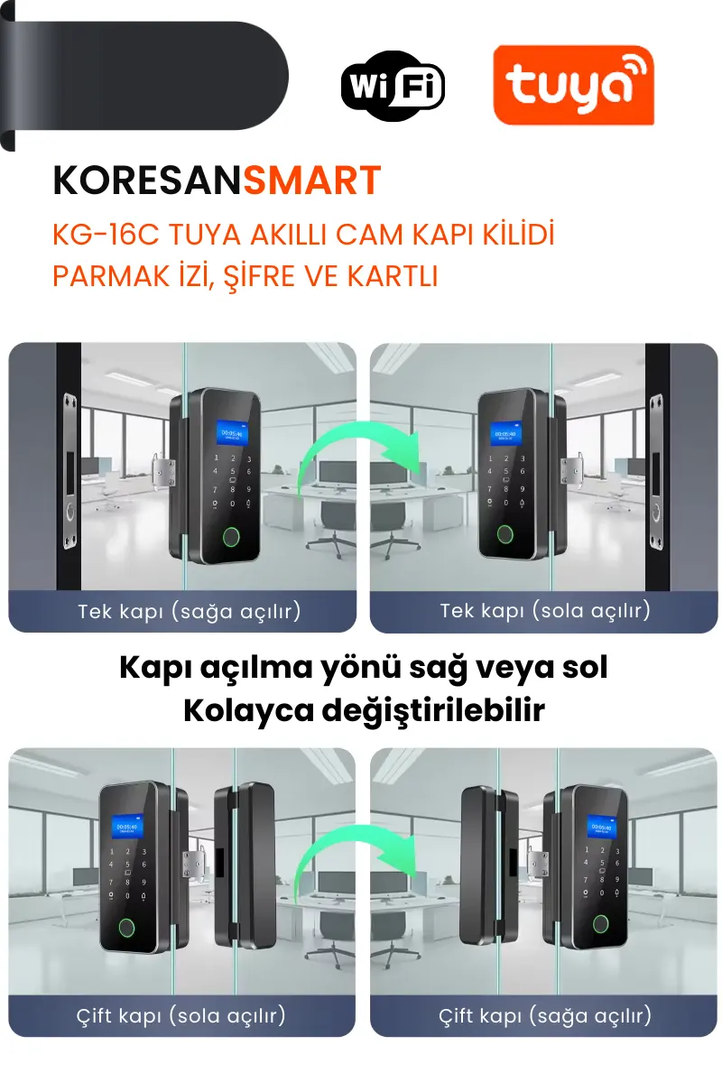 KG-16C Tuya Akıllı Cam Kapı Kilidi, kapının sağa veya sola açılmasına göre ayarlanabilen mekanizması sayesinde tek ya da çift cam kapılarda sorunsuz kullanım sağlar.
