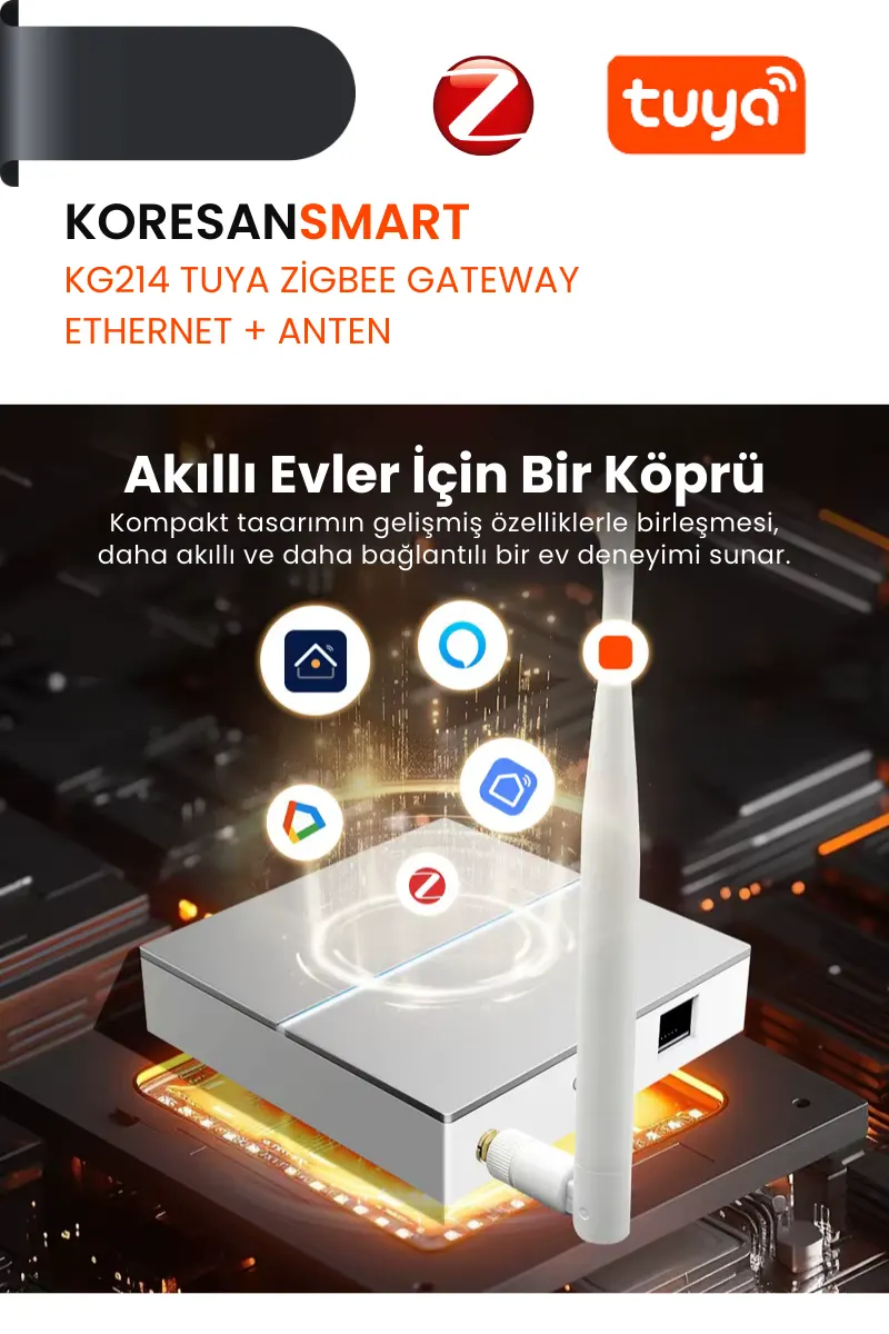 KG214 Tuya Zigbee Gateway Ethernet + Anten Zigbee 3.0 destekli merkezi hub yapısı ile kapı sensörleri, PIR hareket sensörleri, akıllı ampuller, prizler ve çevresel sensörleri tek bir noktadan yönetmenizi sağlar. Kablolu Ethernet bağlantısı sayesinde stabil, hızlı ve güvenilir akıllı ev kontrol altyapısı oluşturur.