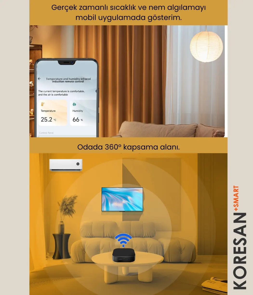 Tuya Sıcaklık ve Nem Sensörlü IR Uzaktan Kumanda, sıcaklık ve nem sensörü entegreli bir kumandadır. Gerçek zamanlı olarak sıcaklık ve nemi algılar ve mobil uygulamada gösterir. Mobil telefon üzerinden cihazlarınızı kontrol etmenizi sağlar. Geleneksel kızılötesi (IR) uzaktan kumandaların yerini alır.