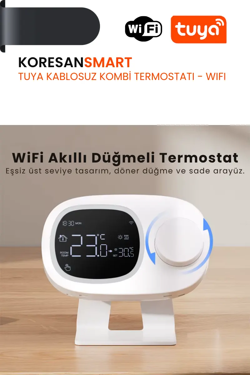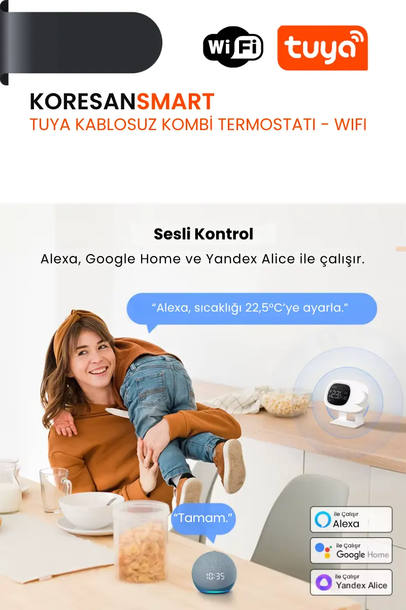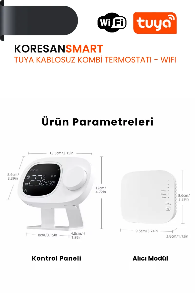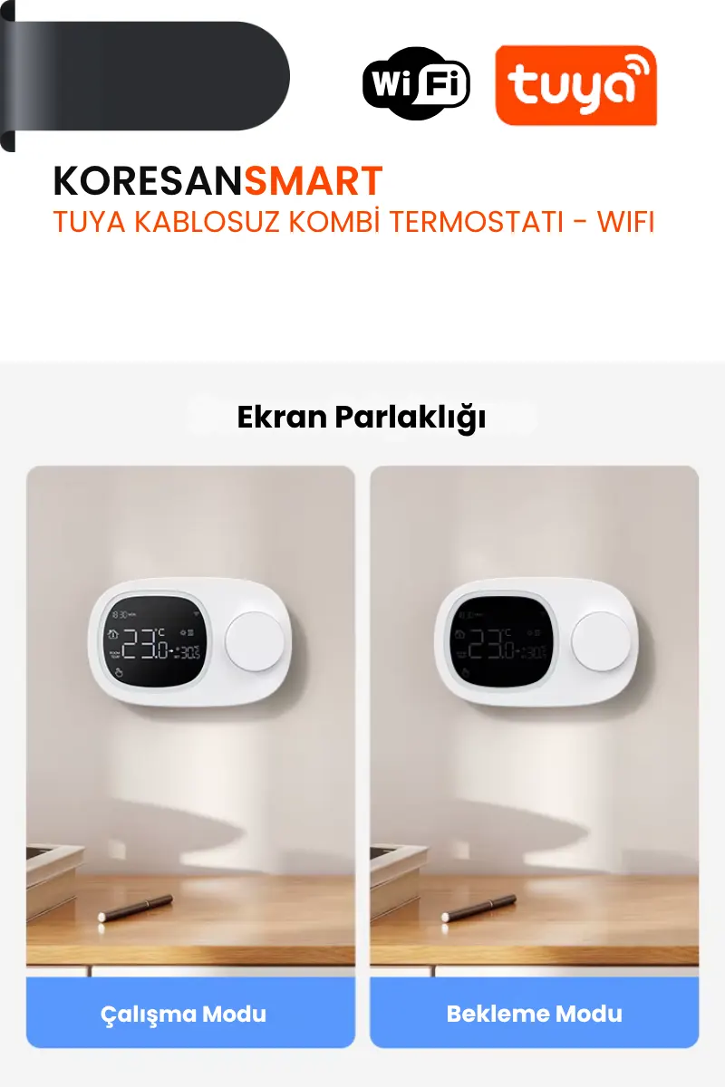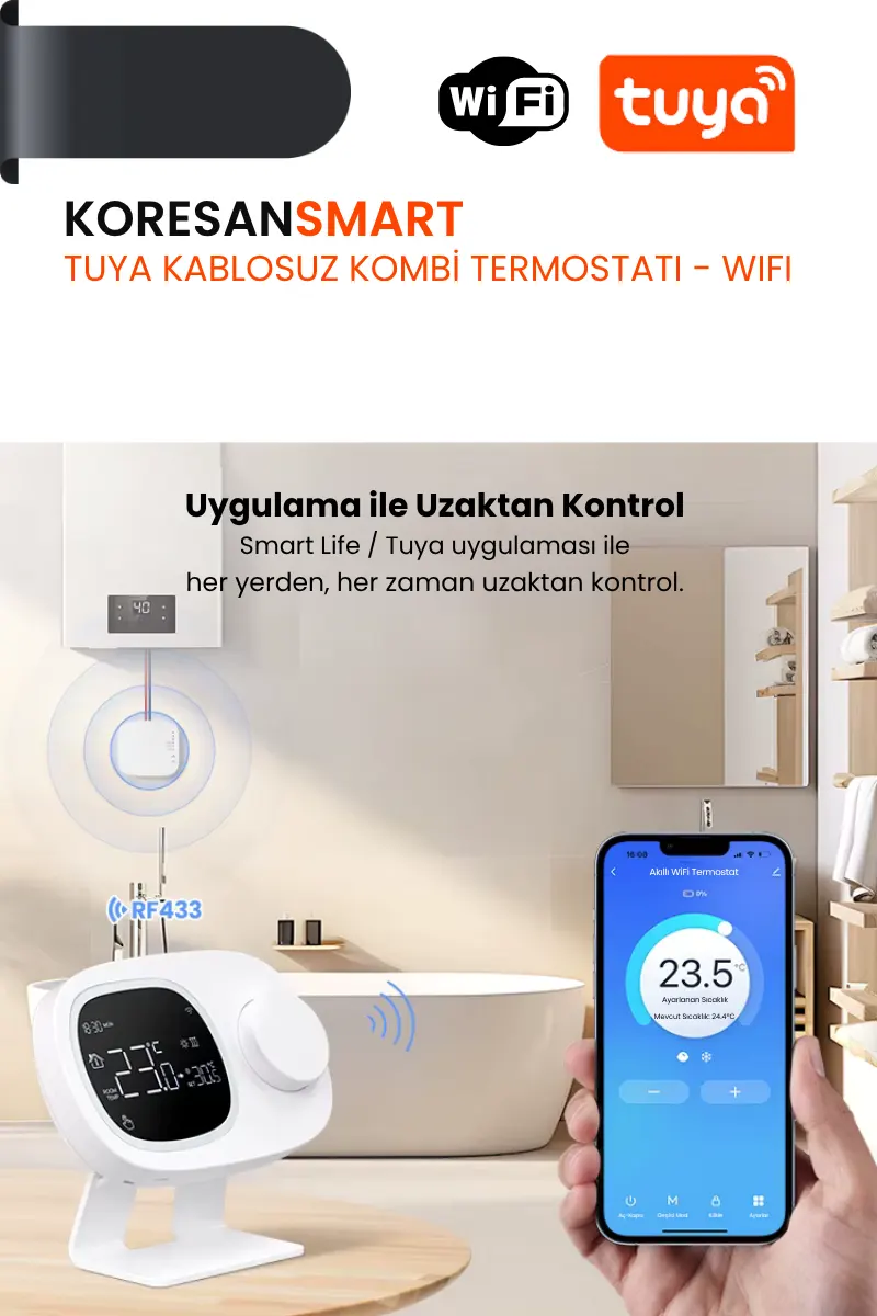 Tuya Wifi Kablosuz Kombi Termostatı, RF433 alıcı modülü sayesinde kombiye kablo çekmeden bağlanır ve oda termostatı üzerinden sıcaklık ayarı yapılmasını sağlar. Akıllı telefon uygulamasıyla desteklenen bu kablosuz yapı, montaj kolaylığı ve kullanım konforu sunar.
