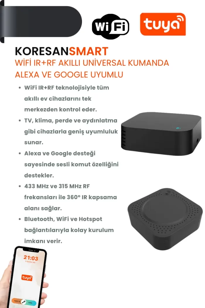 WiFi IR+RF Akıllı Universal Kumanda – Alexa ve Google Uyumlu model, RF433 ve RF315 MHz desteğiyle Bluetooth, WiFi ve Hotspot üzerinden çoklu bağlantı sağlar. 360° kapsama, zamanlama ve sesli kontrol desteğiyle akıllı ev cihazlarınızı kolayca yönetebilirsiniz.